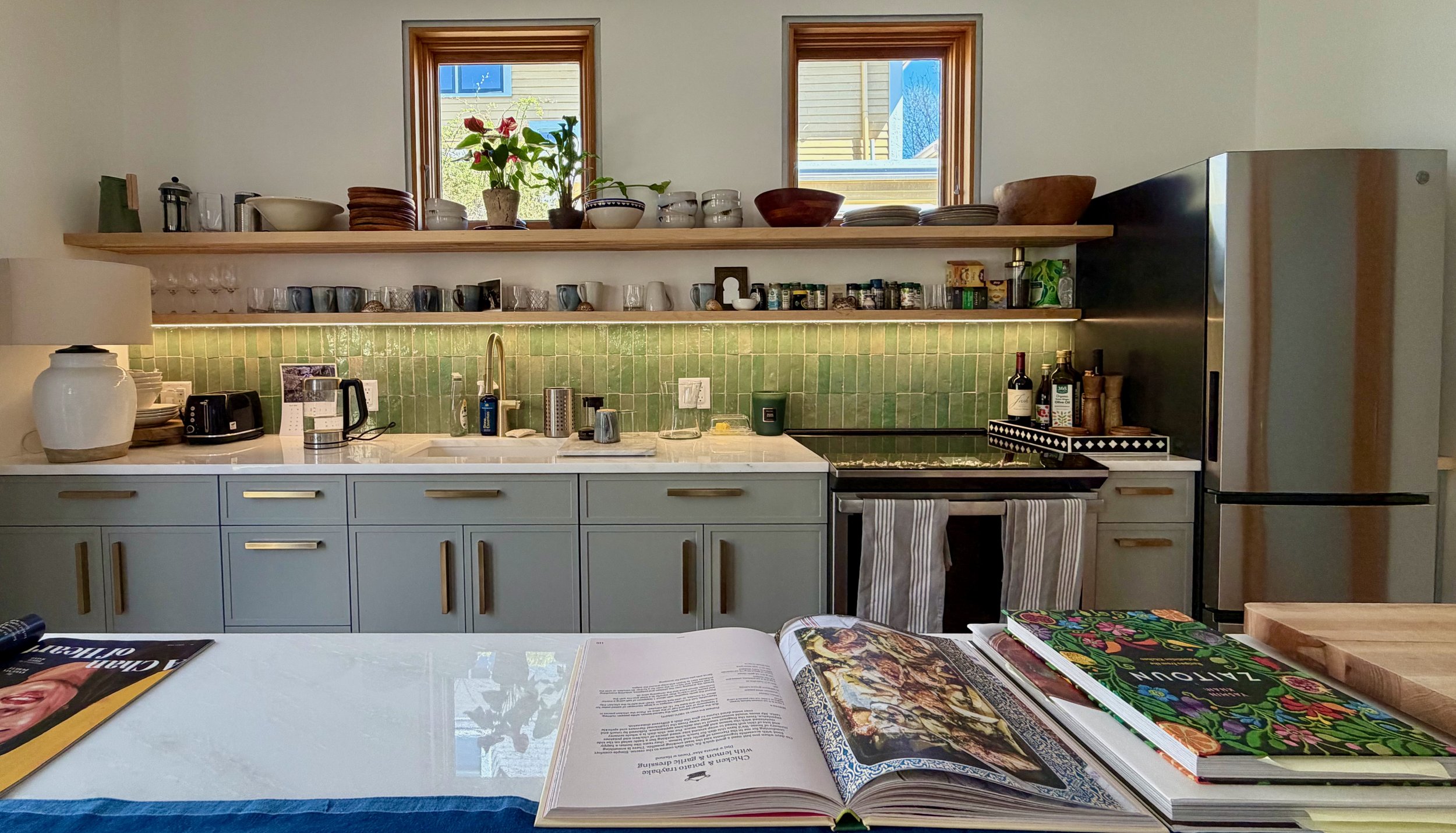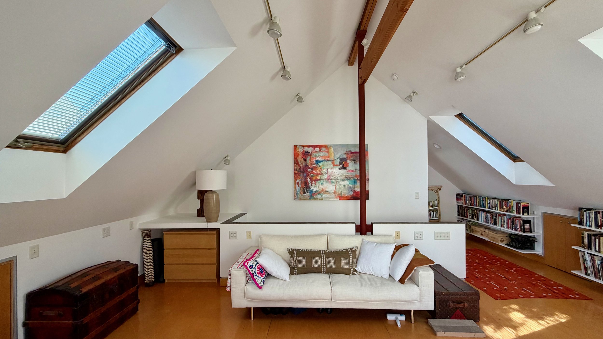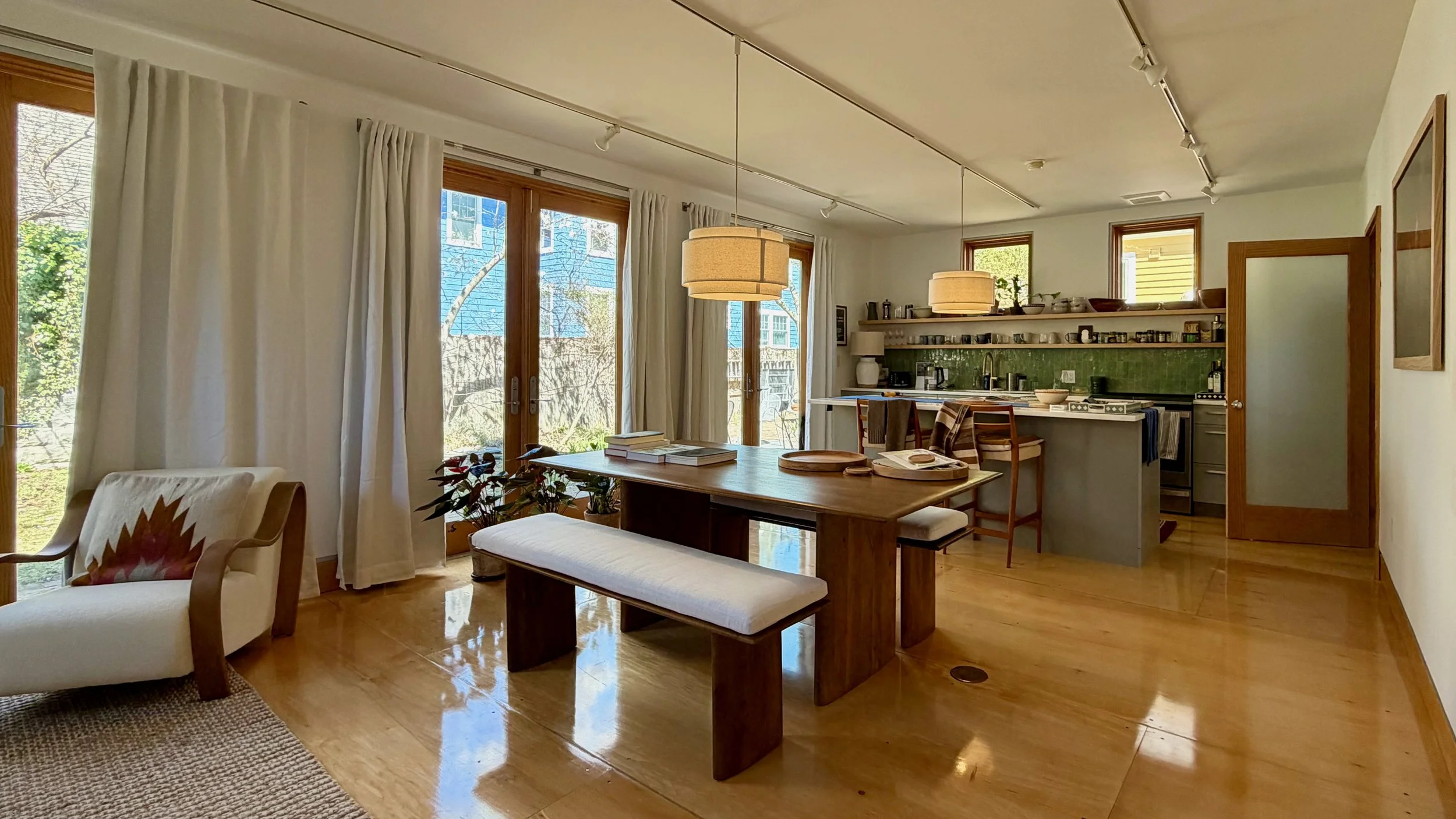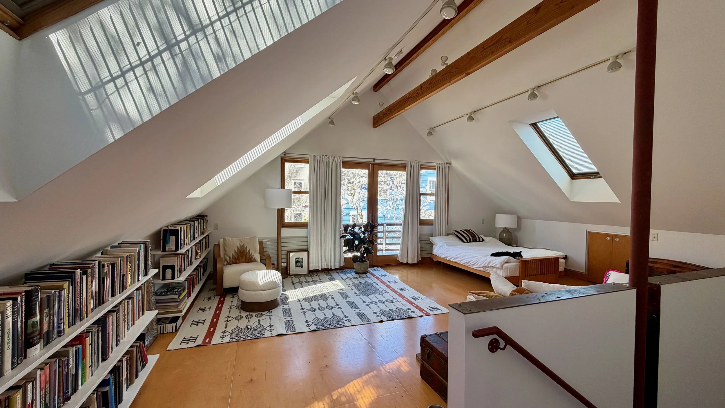 In 2025 the 204 Erie Street carriage house was permitted under CambridgeAccessory Dwelling Unit regulations, to be converted to a 1-bedroom apartment. On the ground floor the office space was made into kitchen / dining / living space with a laundry and storage at the back. On the upper floor, what had been an office library is now a bedroom with a full renovated bathroom.